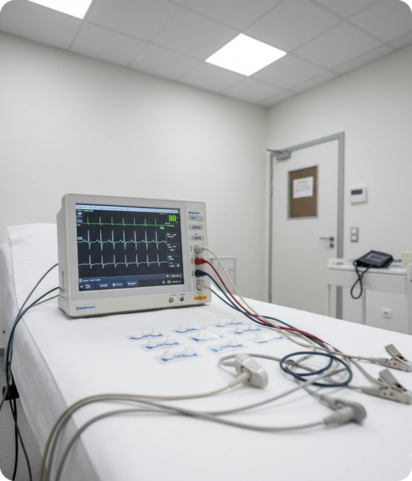 Non-invasive test that records heart’s electrical activity to detect rhythm disturbances, ischemia, and other cardiac abnormalities accurately.