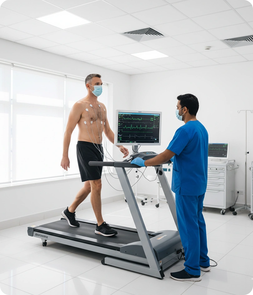 A Treadmill Test (TMT) assesses how effectively the heart functions during controlled physical activity by monitoring cardiovascular response to increasing workload demands. By gradually elevating exercise intensity on a motorized treadmill, doctors can observe real-time changes in heart rate, cardiac rhythm, blood pressure response, and ECG patterns that reveal underlying coronary issues.